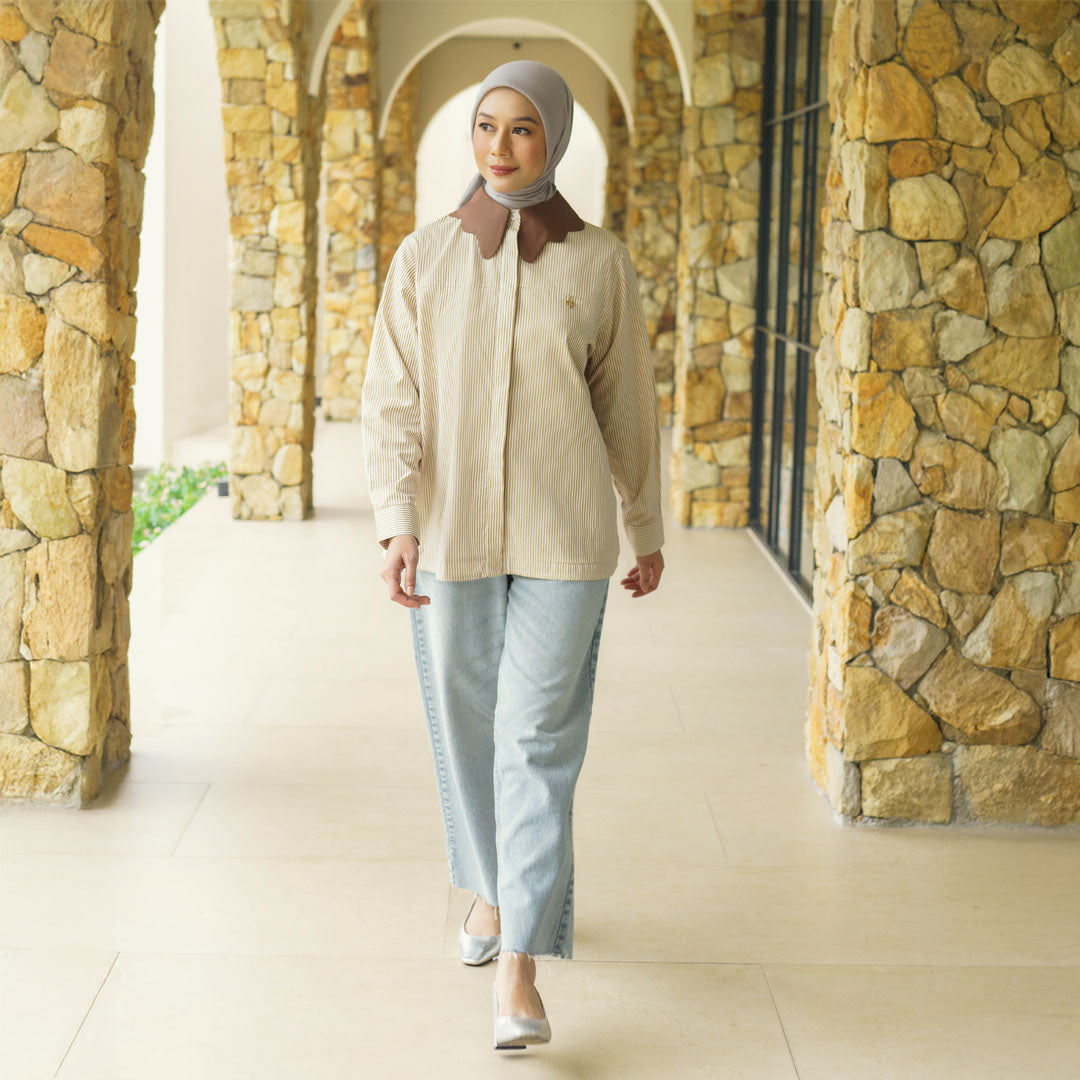 Raniza Top is a stylish women's shirt designed with a classic front button opening and uniquely tailored cuffs. Crafted from soft and comfortable fabric, it offers all-day ease. A signature Jenna and Kaia metal plate on the left chest adds an elegant detail. Versatile and timeless, Raniza Top is perfect for both casual outings and semi-formal occasions.