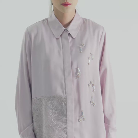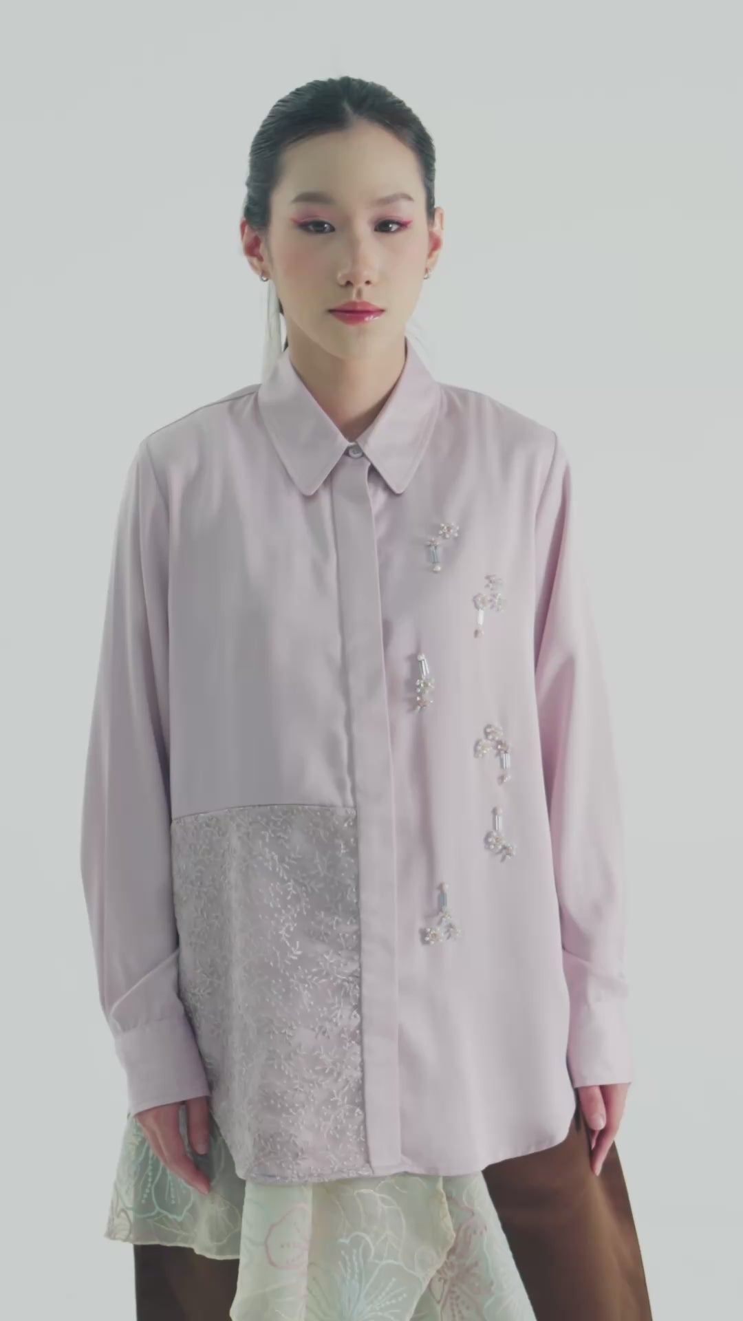 A simple top design with cut and sew details, using comfortable material when worn, with hidden button opening details on the front, as well as a combination of lace material details in the form of cuts with asymmetric placement on the front, in addition there are beading accents to beautify the look