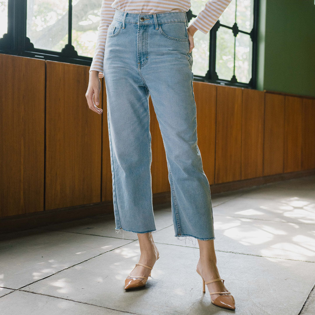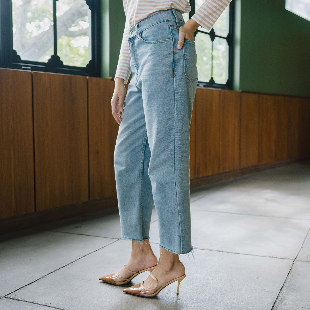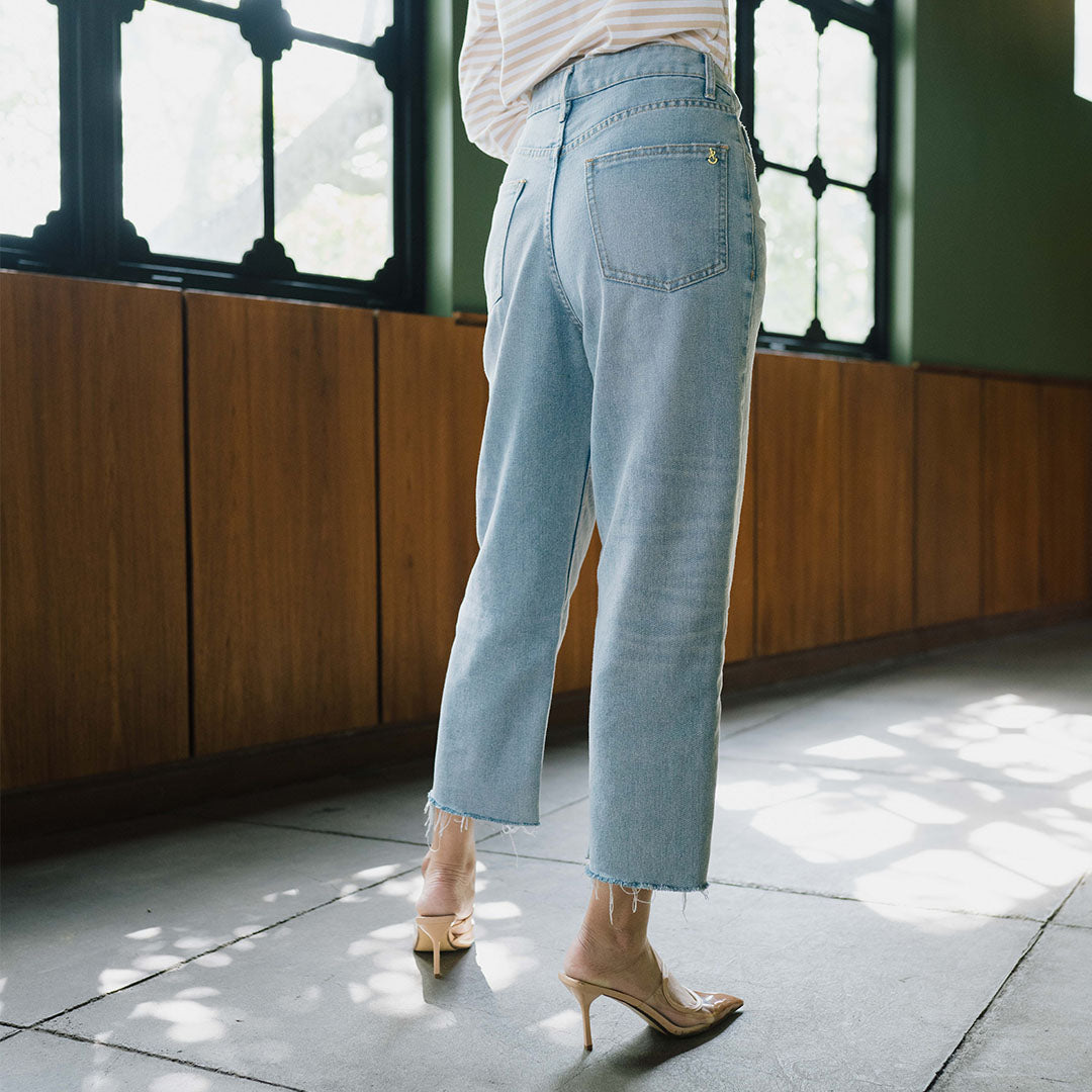 Freeya Denim Pants is a timeless Mom's Jeans cut. It is comfortable for everyday use and easy to mix and match, both formal and informal styles.These jeans have an unfinished detail on the bottom of the leg that gives a trendy impression. The loose pattern of the jeans on the calves also allows these jeans to cover the shape of the body, making them safe for women and hijab-friendly..