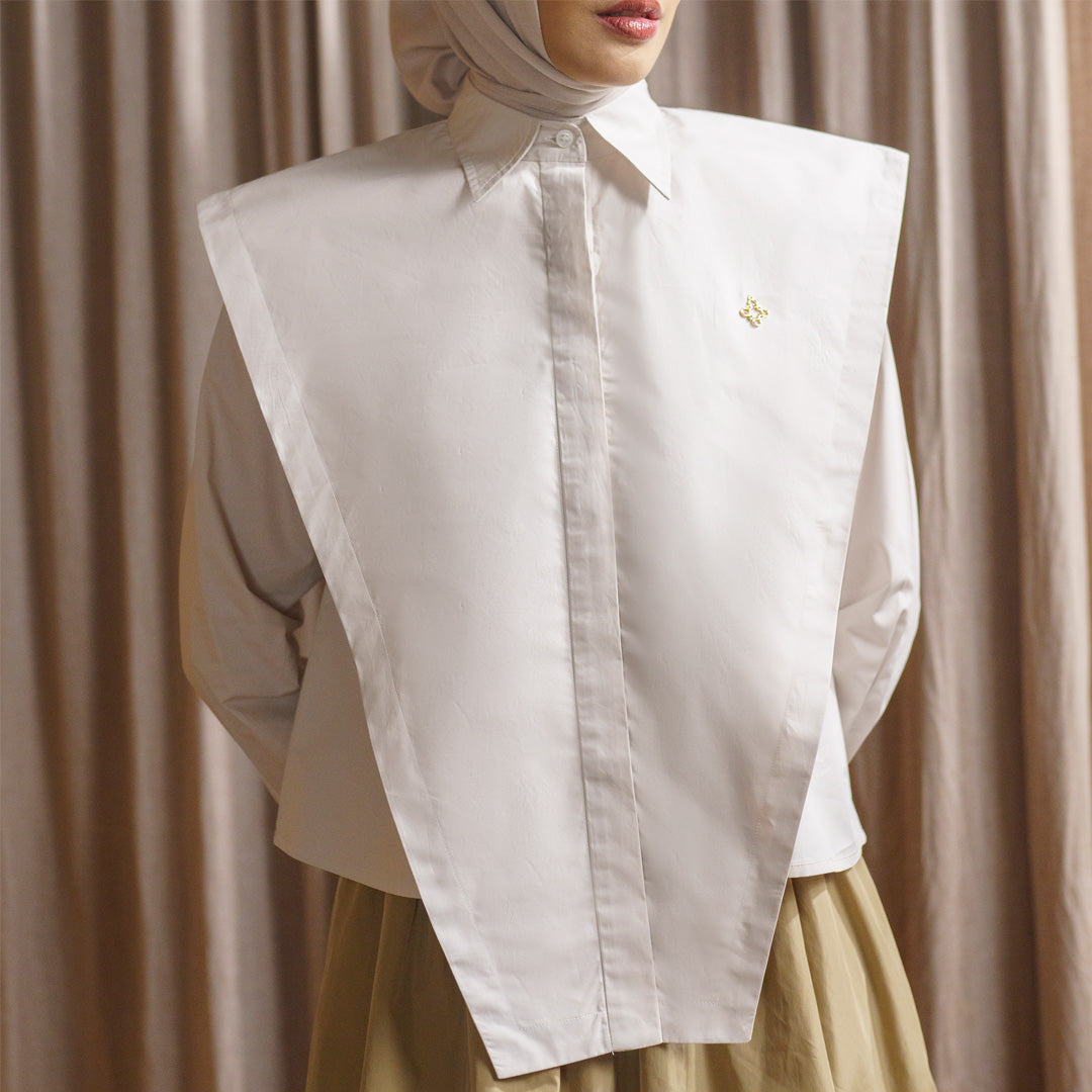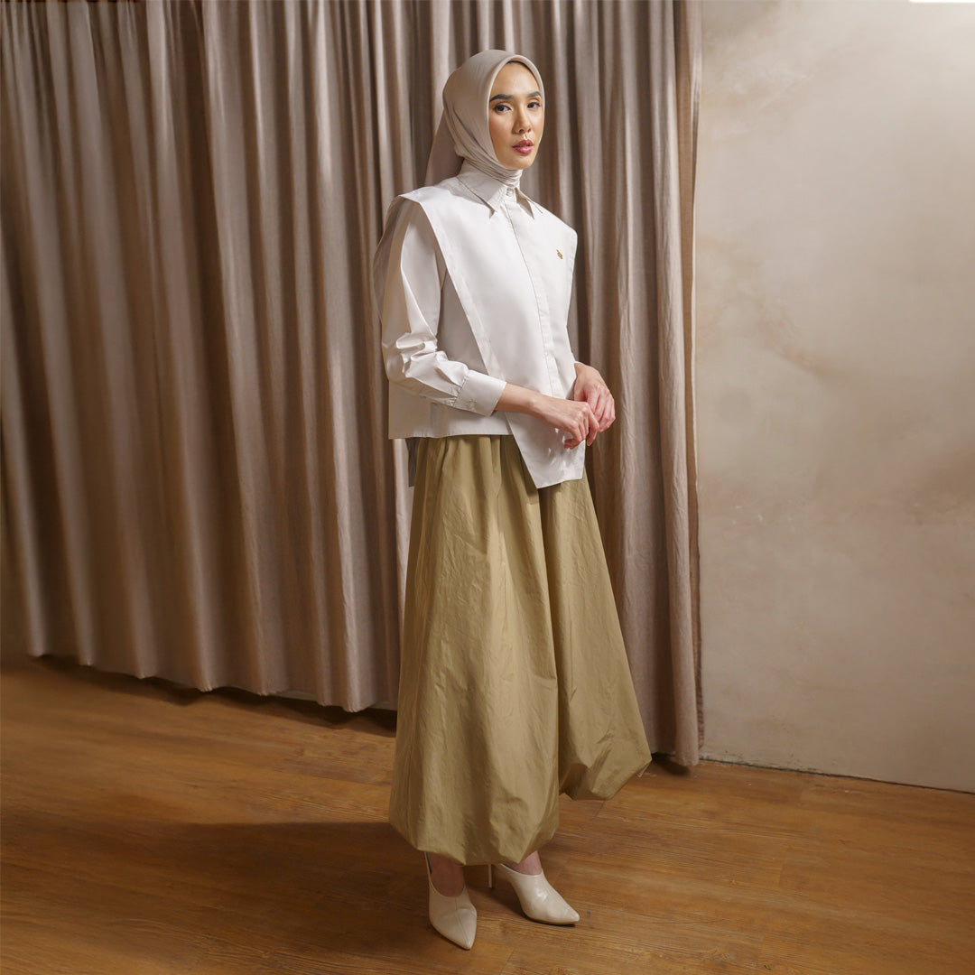 Glea Top is a loose fit and unique layered top with button openings on the front, Jenna and Kaia's anagram logo plate, and basic sleeves with button openings on the cuffs, suitable for use in supporting daily activities.