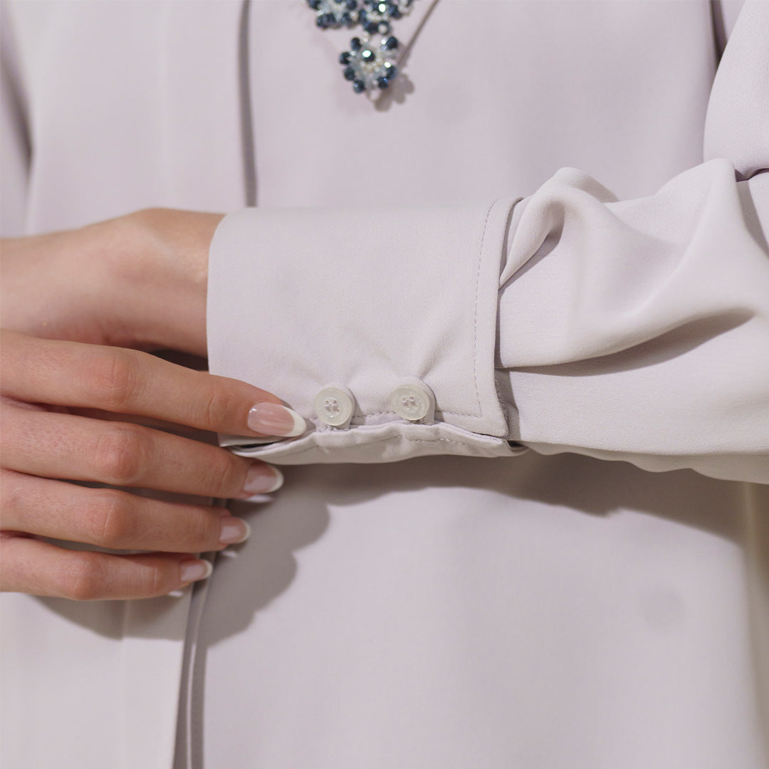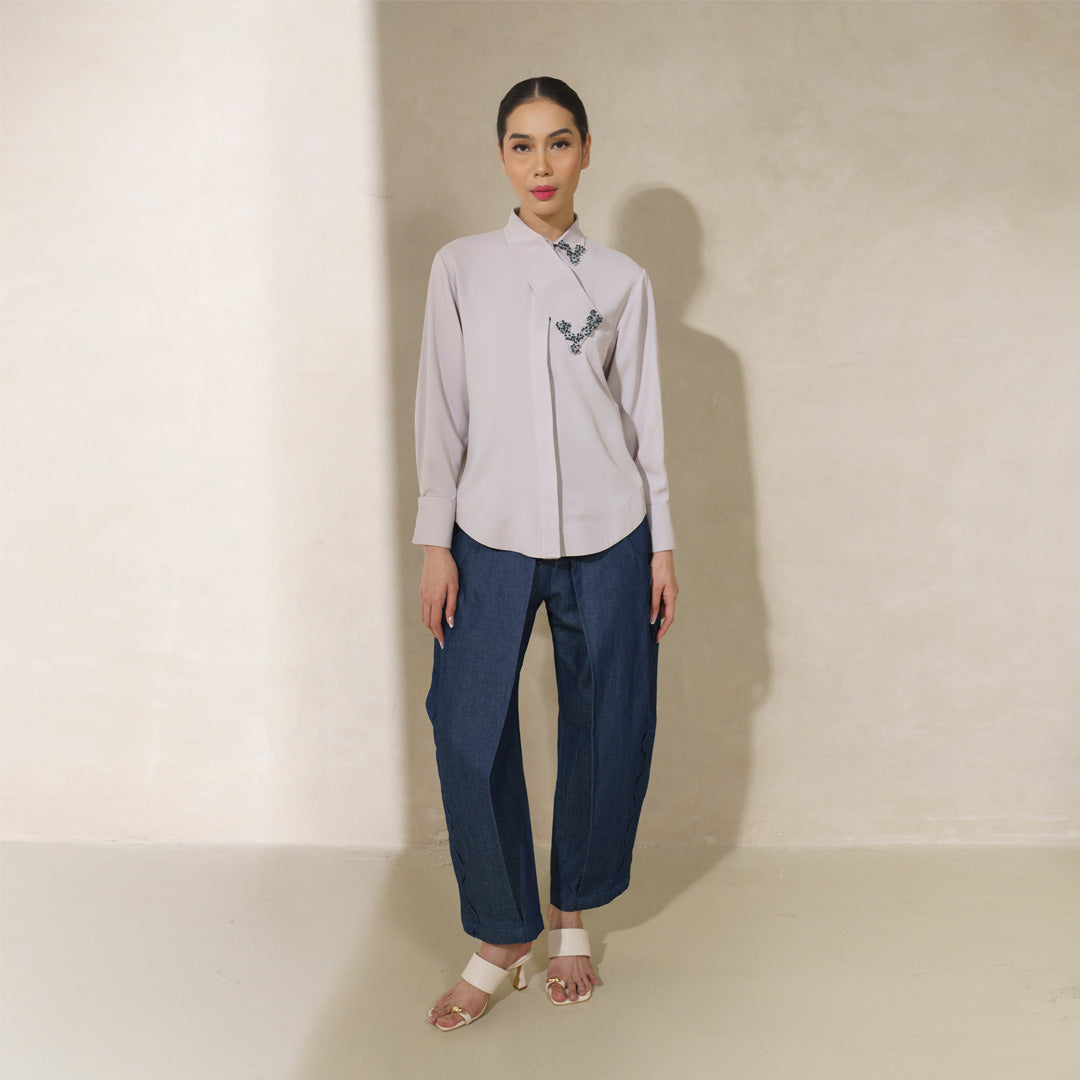 Irina Top is a simple yet comfortable shirt crafted from premium, soft-touch fabric for an effortlessly elevated look. It features a unique asymmetrical collar variation, a hidden button-down opening at the front, and a relaxed loose-fit silhouette with rounded hem details. The cuffs come with a versatile two-way design, while our signature handmade beading add a refined decorative touch.