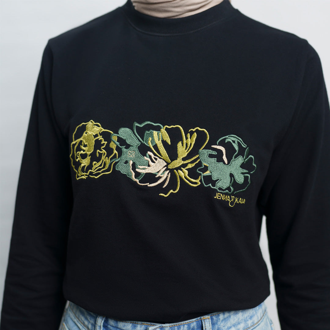 Lavya Top is a long-sleeve tee crafted from soft, breathable cotton, designed for all-day comfort. It features an elegant floral embroidery in soothing green tones on the chest. With its relaxed fit and clean round neckline, Lavya Top pairs effortlessly with jeans, skirts, or trousers for a casual yet polished look.