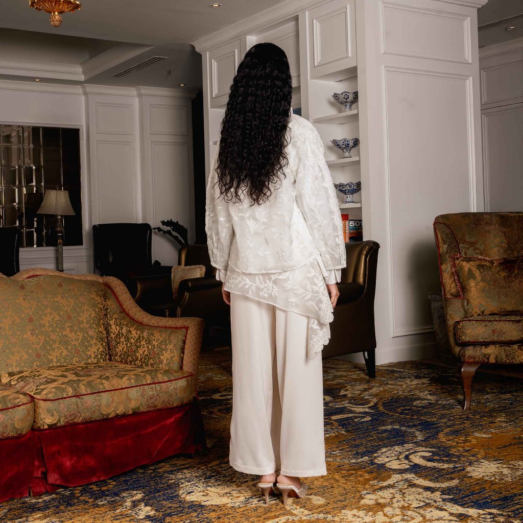 Leila Outer exudes effortless sophistication with its airy, translucent silhouette crafted from embroidered organza. Adorned with delicate floral motifs, this piece captures a sense of modern romance and refinement. Its relaxed fit and baloon sleeves offer graceful movement, while the clean collar and front opening lend a contemporary edge.