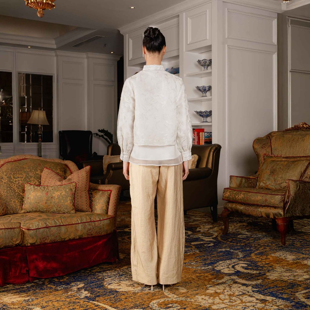 Levara Top presents a refined balance between structure and delicacy. Crafted from sheer embroidered organza, it features intricate floral motifs. The boxy silhouette is enhanced by voluminous sleeves and layered hem details, offering a modern and elegant dimension.