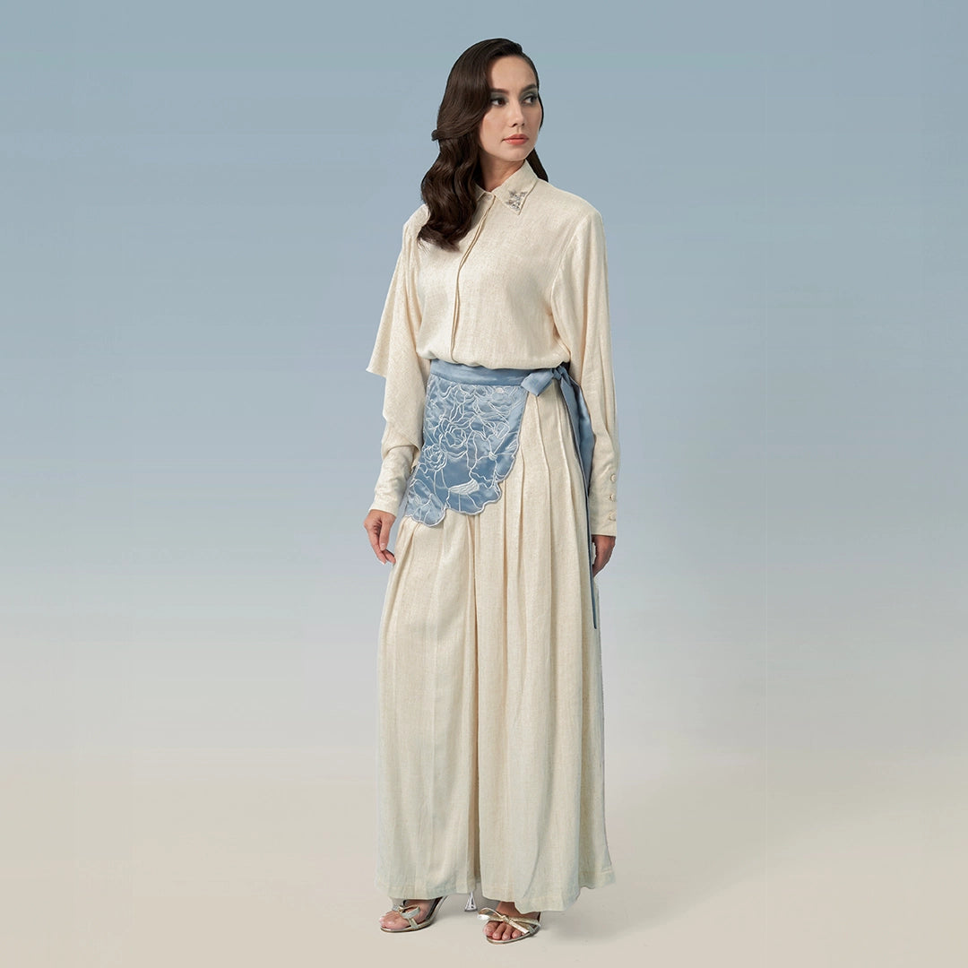 Raiya Top merupakan atasan wanita yang menampilkan keunikan melalui kombinasi bordir sutra rayon (santung) dengan detail laser-cut. Setiap jahitan dan potongan yang presisi menggambarkan esensi kemewahan. Dibuat dari kain linen yang breathable, kemeja bagian dalam dibuat dari bahan yang nyaman.